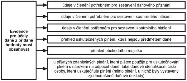 Plátce nebo identifikovaná osoba jsou povinni vést v evidenci pro účely daně z přidané hodnoty především veškeré údaje vztahující se k jejich daňové povinnosti, a to v členění potřebném pro sestavení daňového přiznání, souhrnného hlášení nebo kontrolního hlášení.